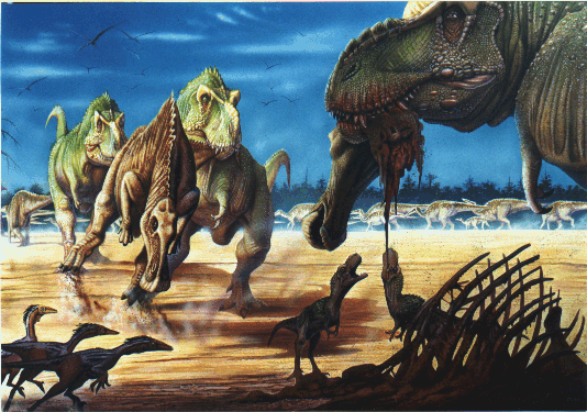 Tyrance put his foot atop of the prey, he looked into the distance and watched the herd run, it gave him pleasure, assuring his position as the top of the food-chain. Tyrance ravaged his meal, he ripped out entire chunks of meat and swallowed them whole, one of these meat chunks was 310 pounds, he swallowed it with no problem. Blood dripped down Tyrance's massive jaws, he had ate to his heart's content and lay down to rest. As Tyrance rested however, his scent caught something in the distance, could it be the demon that killed his whole pack? Tyrance stood up and watched a nearby clay cave, out came a Acrocanthosaurus, it had been watching him and was determined to get his meal.